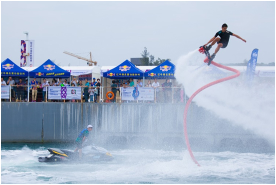 現(xiàn)場(chǎng)的水上飛行花式表演,選手在海面上翻騰、滑行,展示了飛人、立式艇、水上飛旋等精彩紛呈的動(dòng)作,吸引了大量觀眾在觀賞區(qū)觀看。