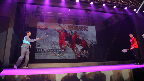 馬布里與傅海峰在發(fā)布會現(xiàn)場切磋羽毛球