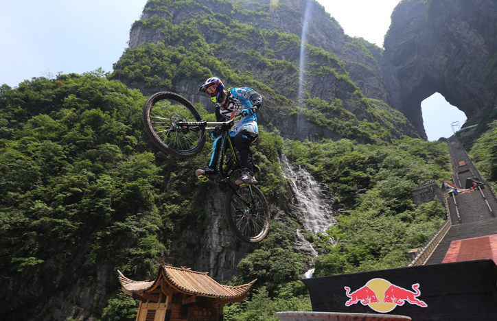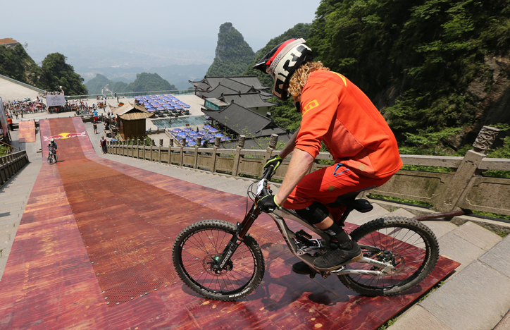 紅牛天梯速降賽選手對(duì)位于張家界天門(mén)山的賽道陸續(xù)進(jìn)行了實(shí)測(cè)和適應(yīng)性訓(xùn)練,盡管賽事組織方科學(xué)設(shè)置了幾處技術(shù)調(diào)整帶,但這些久經(jīng)沙場(chǎng)的世界級(jí)山地車(chē)速降選手,無(wú)一例外對(duì)于這條海拔1200米峭壁,由999級(jí)階梯構(gòu)成的賽道表示驚訝,在首場(chǎng)試騎過(guò)程中都保持了一定的謹(jǐn)慎。