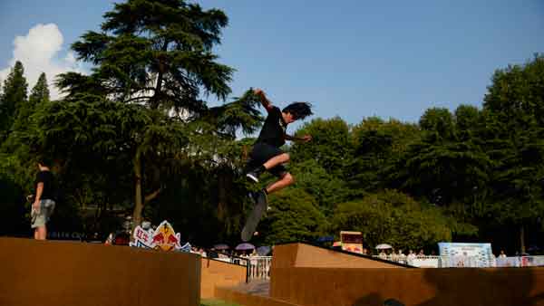 目前居住在上海從事藝術(shù)品生意的美國(guó)人埃利奧特·澤林斯卡斯作為當(dāng)天比賽中唯一一位白皮膚、藍(lán)眼睛的選手,也對(duì)杭州的天氣直接說(shuō)了“I服了You”。“真的很熱很熱,雖然在我的家鄉(xiāng)美國(guó)愛荷華州夏天也熱,但真沒這么熱過(guò)。不過(guò)這次能來(lái)杭州參加這場(chǎng)比賽我也非常高興,可以和大家切磋切磋,展示一下我自己的滑板方式。而今天最讓我驚訝的是這么熱的天,旁邊還有這么多的杭州的觀眾一直在場(chǎng)地周圍為選手鼓掌,我覺得這種氣氛很好。”