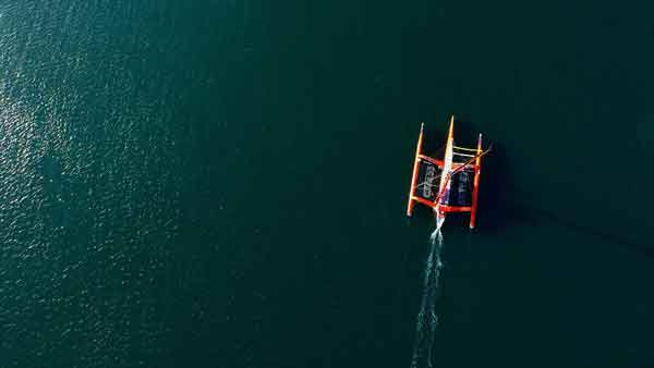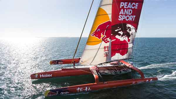 當(dāng)?shù)貢r(shí)間早晨六點(diǎn),法國(guó)西南部港口城市濱海拉特里尼泰一片寧?kù)o。在十幾位岸隊(duì)成員和親友的注目中,“中國(guó)青島”號(hào)三體帆船悄悄移出??苛税雮€(gè)多月的整裝泊位,用船載引擎推動(dòng)駛向航道。這艘帆船界的大型“巡洋艦”橘紅色船身長(zhǎng)達(dá)30米,主桅桿比十層樓房還要高,在這片世界航海圣地港灣如林的船桅中如鶴立雞群。她的出航引起了早起看海的人們的關(guān)注,紛紛在岸邊指指點(diǎn)點(diǎn)。在離開(kāi)港口幾海里后,“中國(guó)青島”號(hào)全體船員協(xié)力升起了主帆,她翩然轉(zhuǎn)身駛向北冰洋。