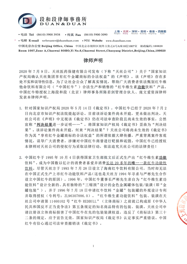 2020年7月9日,天絲醫(yī)藥保健有限公司發(fā)布(下稱“天絲公司”)關于“國家知識產(chǎn)權局確認天絲集團享有紅牛金罐商標的合法權益”的《聲明》。該《聲明》存在多處不實和誤導性信息。為了讓社會公眾了解真實情況,幫助廣大消費者依法甄別紅牛維他命飲料有限公司(“中國紅牛”)合法生產(chǎn)和銷售的“紅牛維生素功能飲料”產(chǎn)品,中國紅牛特授權上海段和段(北京)律師事務所陳若劍管理合伙人、龐文愛資深律師發(fā)表本律師聲明。