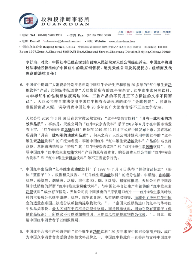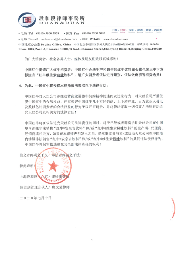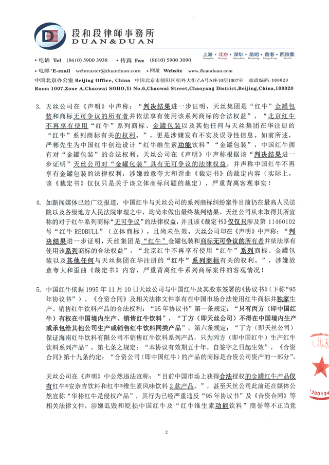 中國紅牛對天絲公司涉嫌違背商業(yè)道德和契約精神的違約及違法行為,對天絲公司嚴重侵犯中國紅牛的合法權益,嚴重損害中國紅牛幾十萬經(jīng)銷商、上下游產(chǎn)業(yè)幾百萬就業(yè)人員以及數(shù)以億計消費者的合法權益的行為予以嚴正譴責,并將依法采取一切必要之法律行動追究天絲公司及相關方的法律責任!
