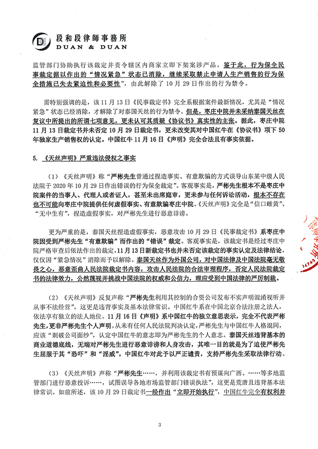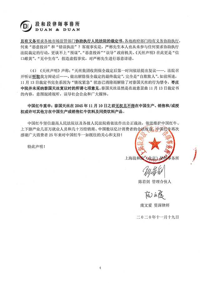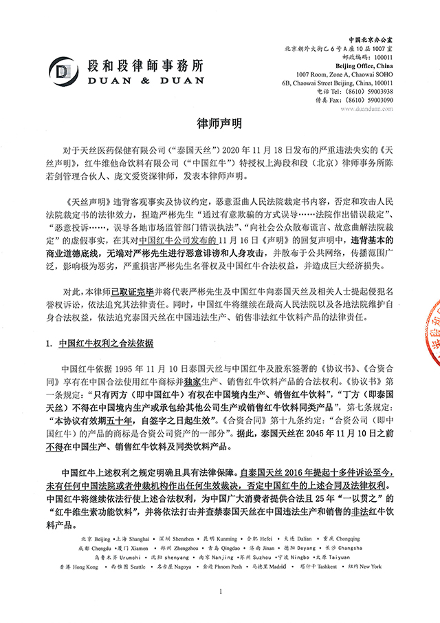 對于天絲醫(yī)藥保健有限公司(“泰國天絲”)2020年11月18日發(fā)布的嚴(yán)重違法失實(shí)的《天絲聲明》,紅牛維他命飲料有限公司(“中國紅牛”)特授權(quán)上海段和段(北京)律師事務(wù)所陳若劍管理合伙人、龐文愛資深律師,發(fā)表本律師聲明。
