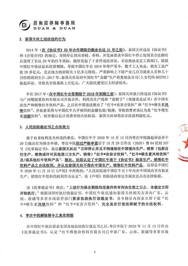 基于自身權(quán)利及天絲違約事實(shí),中國紅牛于2020年10月12日向棗莊中院提起訴訟并于29日提出行為保全申請,棗莊中院經(jīng)過嚴(yán)格審查后于10月29日作出(2020)魯04民初337號《民事裁定書》,裁定泰國天絲應(yīng)“立即停止并且不得繼續(xù)在中國境內(nèi)生產(chǎn)、銷售(包括自行生產(chǎn)、銷售或許可其他第三方生產(chǎn)、銷售)“紅牛®安奈吉飲料”、“紅牛®維生素風(fēng)味飲料”及/或其他紅牛飲料產(chǎn)品”。據(jù)此,法院認(rèn)定了中國紅?;凇秴f(xié)議書》獨(dú)家生產(chǎn)、銷售紅牛飲料產(chǎn)品之合法權(quán)利,并認(rèn)定泰國天絲不得在中國生產(chǎn)、銷售紅牛飲料產(chǎn)品。這即是中國紅牛2020年11月16日《聲明》中所稱的:“人民法院就中國紅牛五十年內(nèi)在中國境內(nèi)享有獨(dú)家生產(chǎn)、銷售紅牛飲料的權(quán)利作出認(rèn)定”,該《聲明》的陳述內(nèi)容完全屬實(shí)且具有法律依據(jù)。