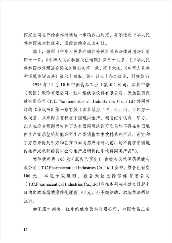 “依照《中華人民共和國涉外民事關系法律適用法》第四十一條,《中華人民共和國民法通則》第五十九條,《中華人民共和國涉外經(jīng)濟合同法》第七條第一款、第十六條,《中華人民共和國民事訴訟法》第六十四條、第一百三十條之規(guī)定,判決如下:1995 年 11 月 10 日中國食品工業(yè)(集團)公司、深圳中浩(集團)股份有限公司、紅牛維他命飲料有限公司、天絲醫(yī)藥保健有限公司共同簽訂的《協(xié)議書》第一條有效(該條款為“甲、乙、丙、丁四方一致同意,只有丙方有權在中國境內生產(chǎn)、銷售紅牛飲料,甲方、乙方在沒有得到丙方和丁方書面同意或許可之前均不得在中國境內生產(chǎn)或承包給其他公司生產(chǎn)或銷售紅牛飲料系列產(chǎn)品。丙方和丁方在未得到甲方和乙方書面同意或許可之前,均不得在中國境內生產(chǎn)或承包給其它公司生產(chǎn)或銷售紅牛飲料同類產(chǎn)品”)。