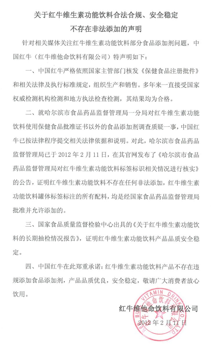 紅牛維生素功能飲料品質(zhì)安全合法合規(guī) 聲明