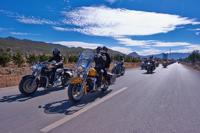 在15日下午1點(diǎn),中國(guó)好機(jī)友機(jī)車俱樂部聯(lián)盟近百余輛機(jī)車、越野車在三朵廣場(chǎng)集結(jié),李亞鵬身著帶有隊(duì)長(zhǎng)袖章的機(jī)車服,率領(lǐng)眾機(jī)車出發(fā)。騎士們?cè)谄鸱娜荷街写┬?,感受騎行的快樂。全程近兩個(gè)小時(shí),車隊(duì)綿延長(zhǎng)達(dá)幾公里,場(chǎng)面十分壯觀。
